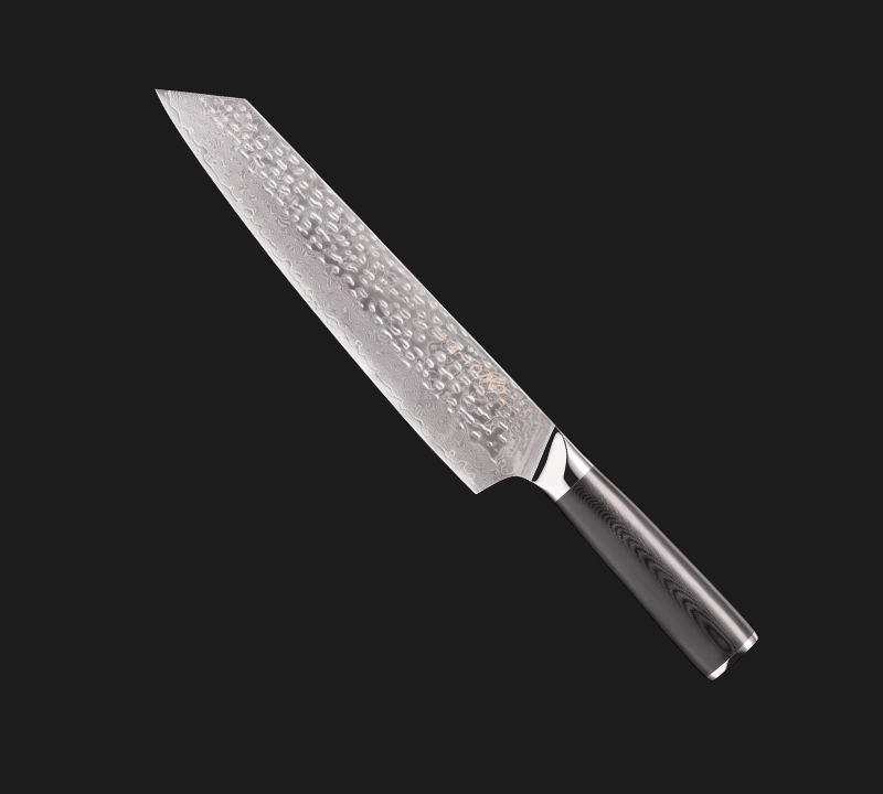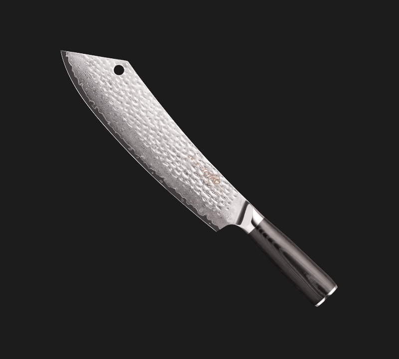 Lama curva in damasco martellato a mano, ideale per carne e verdure.