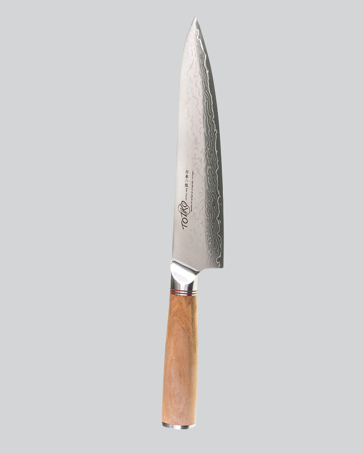 La sua lama da 21 cm presenta una affilatura a V, distintiva dei Coltelli da Chef giapponesi, che garantisce tagli precisi e minimizza lo sforzo, differenziandosi nettamente dai coltelli europei per leggerezza e maneggevolezza.