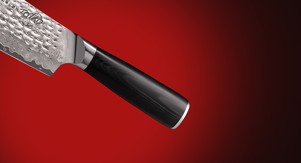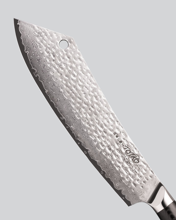 La sua finitura martellata a mano non solo esalta l’artigianato giapponese ma aiuta anche a ridurre l’attrito, evitando che il cibo si attacchi alla lama. Il manico in resina Micarta è progettato per offrire una presa sicura e confortevole, ideale per sessioni prolungate di preparazione.